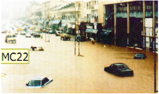 Les événements extrêmes peuvent aussi ravager les cultures et endommager les équipements. La figure 1, montre un cas d’inondation dans la ville de Yaoundé le 9 le mai 2007. Nous voyons que les voitures sont immergées au trois quart et les bâtiments pratiquement au un quart, paralysant ainsi l’activité quotidienne des citoyens. La connaissance sur la fréquence et l’intensité des événements extrêmes est donc d’une première importance pour la société.