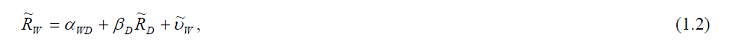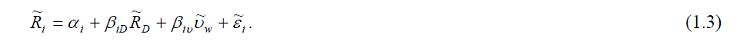 Où RW~ est la rentabilité du portefeuille de marché mondial, RD~ est la rentabilité de portefeuille domestique et υW~ est la composante de la rentabilité du portefeuille mondial non corrélée avec le portefeuille domestique. Une deuxième régression fait partie du premier compartiment, qui permet l’estimation des coefficients bêta de chaque actif domestique individualisé i, par rapport à l’indice domestique et à la composante υW~ de l’indice mondial :