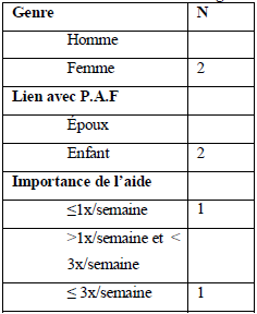 L’échantillon d’AF est sélectif, il a été construit pour inclure un maximum de types d’aide. Deux grandes classes : les AF du domicile et ceux de l’hôpital. Les AF de l’hôpital sont des professionnels qui sont en lien direct avec les acteurs du domicile. Il s’agit en effet, d’une infirmière de l’HJG et d’une assistante sociale.