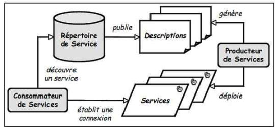 Le producteur a pour fonction de déployer un service sur un serveur et de générer une description de ce service. Cette dernière précise à la fois les opérations disponibles et leur mode d’invocation. Cette description est publiée dans un répertoire de services, aussi appelé annuaire. Les consommateurs peuvent découvrir les services disponibles et obtenir leur description en lançant une recherche sur un répertoire. Ils peuvent ensuite utiliser la description du service ainsi obtenue pour établir une connexion avec le fournisseur et invoquer les opérations du service souhaité.