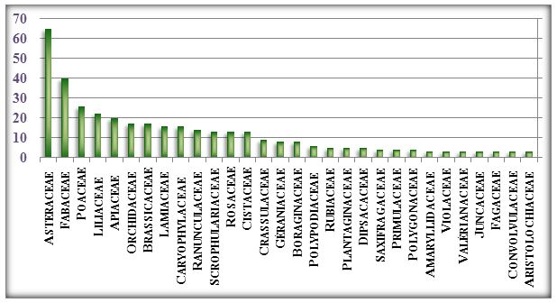 D’après le diagramme, on remarque que la famille des Asteraceae et des Fabaceae sont les plus représentées par un nombre élevé d’espèces de 65 et 40 respectivement, viennent en deuxième lieu les Poaceae, Liliaceae et Apiaceae avec 26, 22 et 20 espèces respectivement.