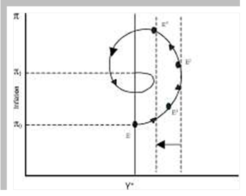 Deux caractéristiques supplémentaires de l’ajustement du processus sont importantes à noter. D’abord, il y a des périodes où la production diminue et le taux d’inflation augmente, par exemple, entre E2 et E3. Cette relation négative entre l’inflation et la croissance est importante, a lieu entièrement souvent dans la pratique, comme il est constaté par la littérature empirique. Ce phénomène est la stagflation, quand l’inflation augmente pendant que la production baisse ou reste stable. Aussi, l’économie ne va pas directement à un taux d’inflation élevé, mais suit un sentier transitoire quand l’inflation augmente et baisse ensuite.