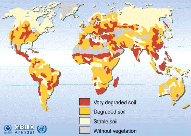 Vers les années 90, la plupart des terres dégradées dans le monde étaient frappées par une dégradation moyenne : (470,3 millions d’hectares, soit 45,15% des terres) ou d’une dégradation légère (427,3 millions d’hectares, soit 41,28% des terres). Puis viennent la dégradation forte : 130,1 millions d’hectares (12,57%) et extrême: 7,5 millions d’hectares (0,72%).