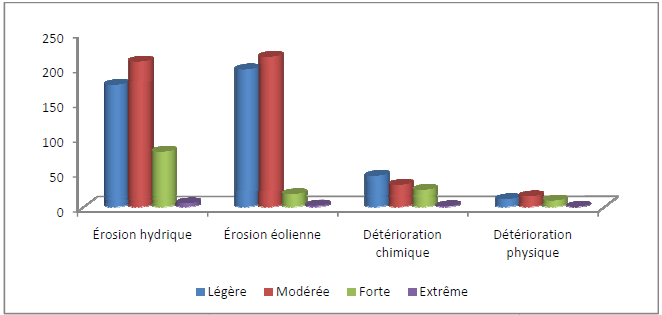 L’érosion hydrique était le premier type de dégradation dans le monde. Elle touchait 467,40 millions d’hectares (45,15%). Elle est suivie par l’érosion éolienne : 432,40 millions d’hectares (41.77%), puis par la détérioration chimique : 100,70 millions d’hectares (9,73%) et la détérioration physique : 34,70 millions d’hectares (3,35%).