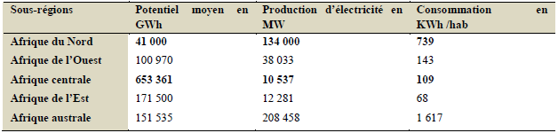 Le potentiel hydroélectrique d’Afrique centrale est estimé à 653,361 GWh, soit 57,7 % de celui du continent africain dans son ensemble, ce qui, avec les ressources en eau et le massif forestier du Congo, confère à la sous-région des avantages comparatifs majeurs, dans la perspective du projet africain d’intégration économique [18]. Dans le même temps, la production d’électricité reste encore marginale (2,6 % des capacités), et la consommation électrique est l’une des plus faibles du continent, avec en moyenne 109 kWh par habitant et par mois, contre 739 en Afrique du Nord, et 1617 en Afrique australe. La mise en valeur du potentiel existant constitue donc à la fois un défi de développement régional, et une opportunité en termes de positionnement stratégique des institutions de coopération régionale d’Afrique centrale.