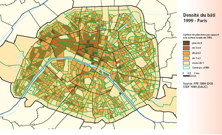 L’analyse de la densité bâtie s’interroge plus largement sur l’ensemble des éléments qui participent à répondre aux besoins des urbanistes dans leurs projets de planification, de mesurer l’étalement urbain et la densification urbaine existante et future. L’exemple de la cartographie réalisée sur la densité bâtie à Paris fera l’objet d’un développement.