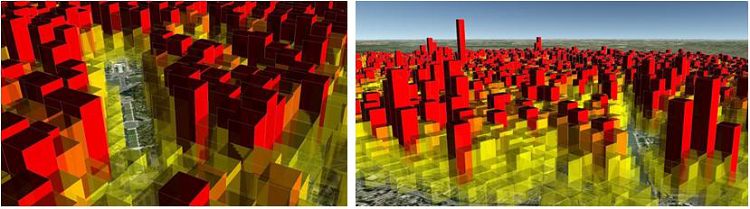 En 2011, la société «Empreinte urbaine », une société des méthodes et outils pour les territoires et qui a programmé opendata.paris, a proposé un nouveau type de représentation à l’appui de la 3D de Google Earth comme le montre la figure suivante.