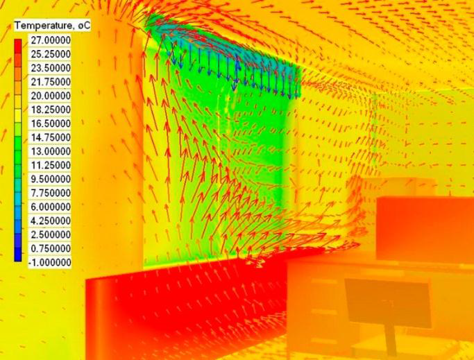 Les simulations de ventilation sont utilisées aussi bien dans l’extérieur des bâtiments que dans l’intérieur, « MeteoDYN », développe aussi des études de confort climatique des espaces extérieurs qui sont basés sur des cartographies 3D du vent réalisé à la demande. En intégrant les données climatiques régionales, il est possible de déduire les fréquences d’inconfort climatiques suivant les critères souhaités. MeteoDYN diagnostique les zones d’inconfort, de gêne, ou même de danger pour les piétons, et apporte les préconisations pour réduire ces effets, comme le montre la figure suivante.