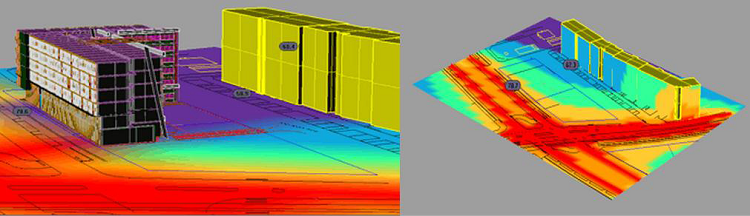 La figure ci-dessus est un rendue réaliser par « CCVH » (Cabinet Conseil Vaincent Herdont), un cabinet d’études d’ingénierie acoustique. Cette cartographie 3D montre l’impact acoustique calculé verticalement sur une façade de bâtiment dans la situation initiale (à droite) et après construction d’un nouveau bâtiment (à gauche). Grace à ce type de module 3D, le calcul est possible sur toute la surface modélisable y compris des façades très complexes.