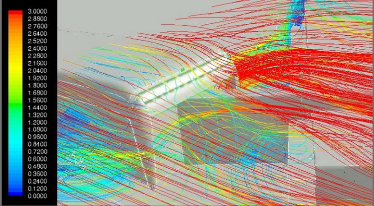 Pour répondre à la problématique de la qualité de l’air intérieur dans l’habitat, deux critères sont pris en compte à savoir : le renouvellement et répartition. « Inopro », une société de la modélisation numérique, propose une simulation 3D du système de prise d’air sur la base d’une perte de charge interne connue. Cette simulation a été la base pour déterminer de manière approximative la plage de fonctionnement, la proposition de modifications et l’optimisation du dispositif caractérisation. Son objectif a été de valider le principe de pré dimensionnement rapide, puis d’effectuer un dimensionnement précis et proposer des solutions, voire les figures suivantes.