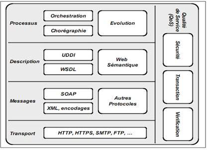 Les services web sont la déclinaison du paradigme des architectures orientées services, sur le web. Bien que les architectures orientées services soient récemment proposées, elles connaissent un engouement et focalisent l’attention de bon nombre de professionnels dans le domaine des technologies de l’information et de la communication, des chercheurs et des industriels. Techniquement, les services web se présentent comme des entités logicielles sans état, dont la caractéristique majeure est de promouvoir un couplage faible. Une architecture à base de services web est une architecture en couches. Le groupe de travail “Web Service Architecture” (WSA) du W3C propose une vision de cette architecture, qui peut elle-même être raffinée n’étant pas unique [14].