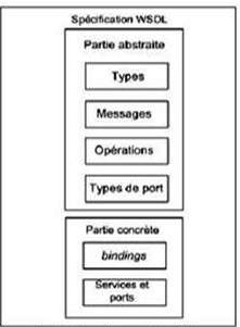 – binding : décrit les spécifications concrètes concernant la manière dont le service sera implémenté : protocole de communication et format des données pour les opérations et messages définis par un type de port particulier. WSDL possède des extensions internes pour définir des services SOAP; de ce fait, les informations spécifiques à SOAP se retrouvent dans cet élément (définition concrète) ;