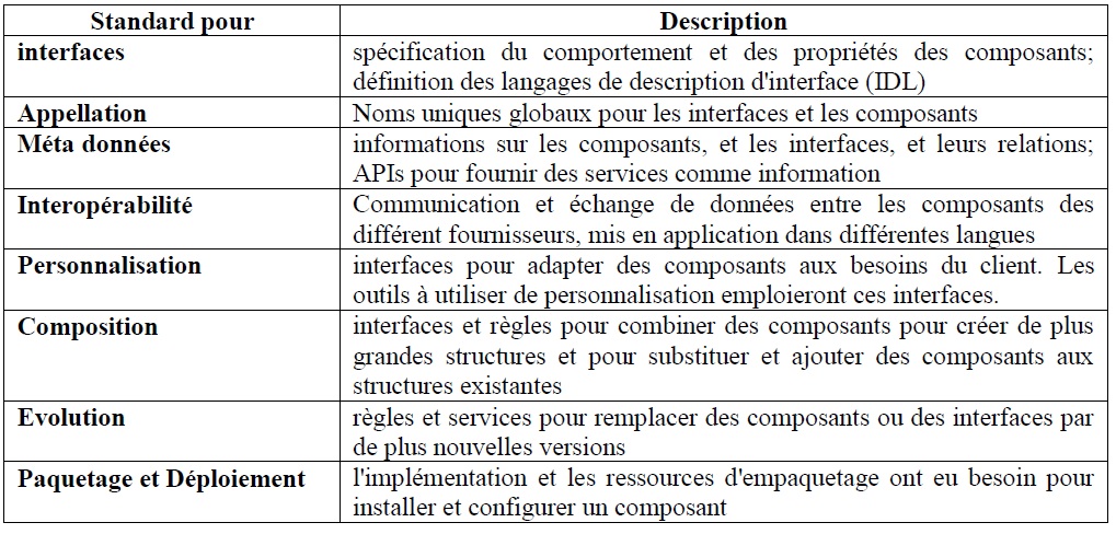 Une telle interopérabilité est un élément central dans un modèle de composant. Les autres éléments de base d’un modèle de composant sont les standards pour les interfaces, l‟appellation, les métadonnées, la personnalisation, la composition, l‟évolution, et le déploiement (voir le tableau ci-dessous).