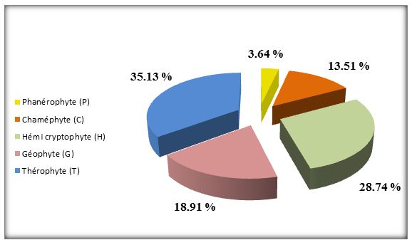 D’après le diagramme, on remarque que les Thérophytes (T) sont les plus représentées avec un taux de 35.13 % suivies par les Hémicryptophytes (H) avec 28.74 %, les Géophytes (G) 18.91 %, les Chaméphyes (C) avec 13.51 % et les Phanérophytes (P) avec 3.64 %. Ceci montre l’importance des plantes annuelles sur le plan floristique et le degré d’ouverture et de dégradation du milieu. En effet, un nombre élevé de thérophytes indique une forte perturbation du milieu par l’activité anthropozoïque, notamment le pâturage. DAHMANI, 1996).
