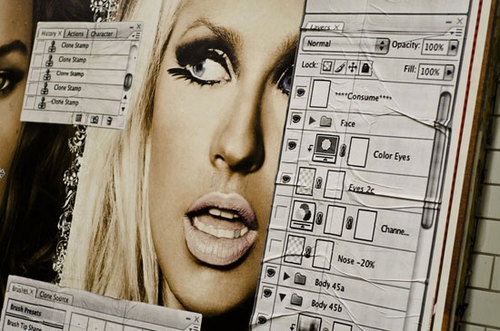 Recadrer l’image peut en faire apparaître la fiction : par exemple en ajoutant les barres d’outils du logiciel Photoshop autour du portrait promotionnel d’une chanteuse pop, on démontre ou rappelle qu’elle n’est qu’un produit, visuel et sonore, une entité imaginaire, qui peut faire rêver, mais à la manière d’une princesse de conte de fée, et non comme un idéal humainement atteignable [29].