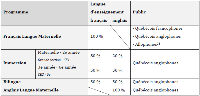 Ci-après un tableau représentant l’ensemble des 4 programmes du MELS avec la ou les langues d’enseignement et le public concerné, c’est-à-dire celui qui a le droit de suivre ce programme. En italique est indiqué le niveau correspondant dans le système scolaire français.