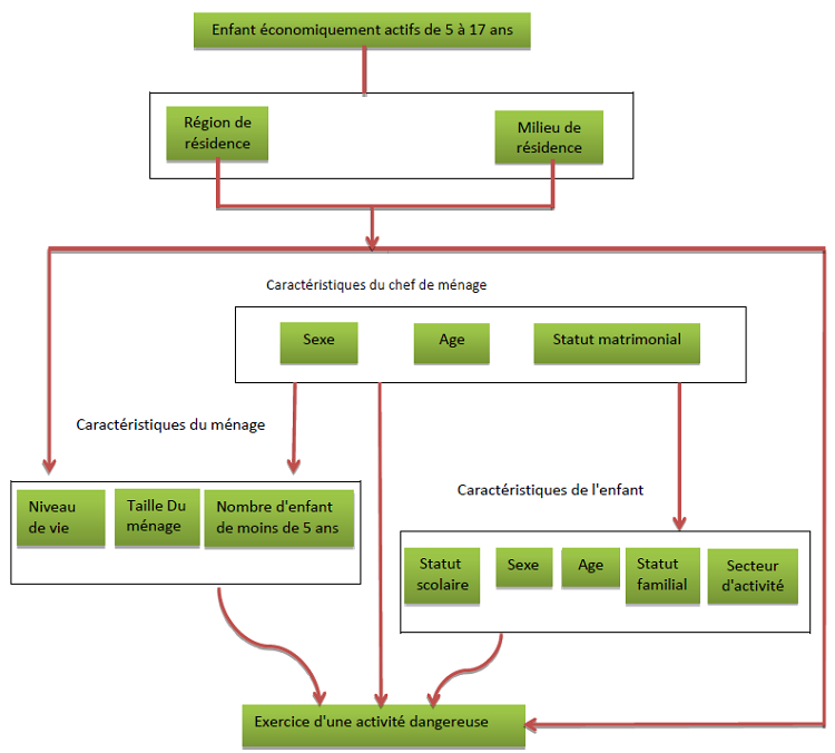 Le cadre conceptuel de l’étude comporte quatre niveaux de facteurs explicatifs des travaux dangereux des enfants. Au premier niveau se trouvent les facteurs liés à l’environnement géographique de l’enfant. Il s’agit de la région de résidence et du milieu de résidence. Le deuxième niveau regroupe les caractéristiques du chef de ménage. On a son sexe, son âge et son statut matrimonial. Ces facteurs agissent au troisième niveau sur les caractéristiques du ménage (la taille du ménage, le nombre d’enfants de moins de 5ans et le niveau de vie) et au quatrième niveau sur les caractéristiques de l’enfant (le statut scolaire de l’enfant, son sexe, son âge, son statut familial et son secteur d’activité).