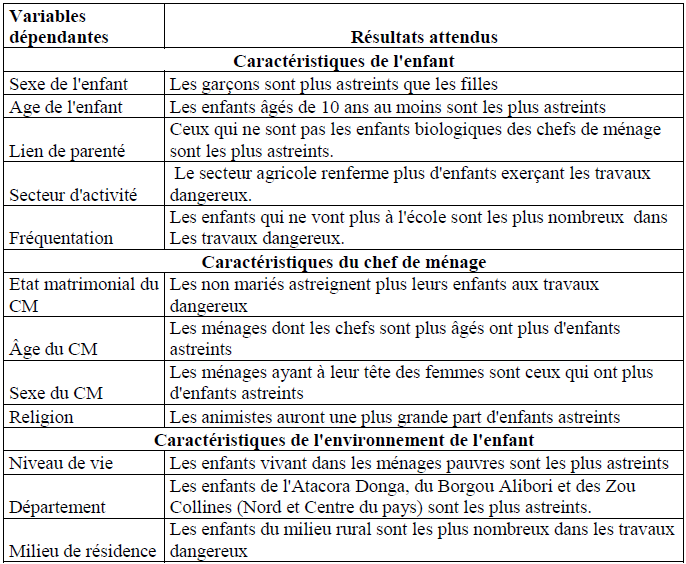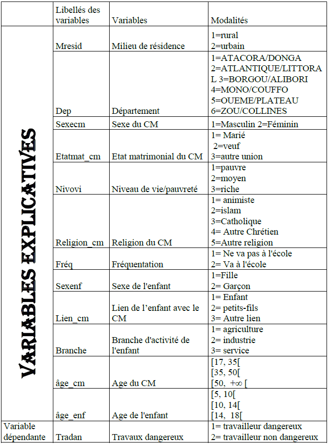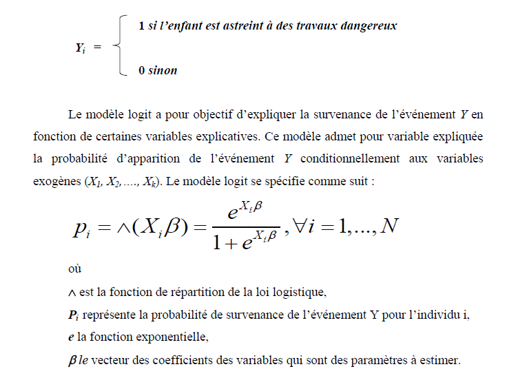 Cette variable est dichotomique et prend la valeur 1 si l’enfant exerce une activité dangereuse et 0 sinon.