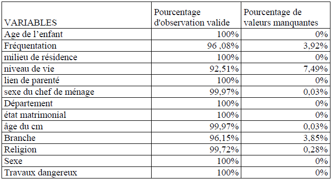 L’étude de la qualité des données repose sur l’évaluation des taux de réponse des variables retenues pour l’étude qui permet de déceler les erreurs éventuelles qui peuvent entacher les analyses et d’apprécier la justesse des estimateurs qui en résultent. En effet, un taux de non réponse supérieur à 10% pour les variables explicatives, affecte sensiblement la précision des estimations, cause des biais de représentativité et dans le cas des analyses multivariées entraîne des pertes importantes d’informations. Les résultats du tableau suivant montrent que les taux de non réponse enregistrés pour les variables de notre étude sont inférieurs à 10%.