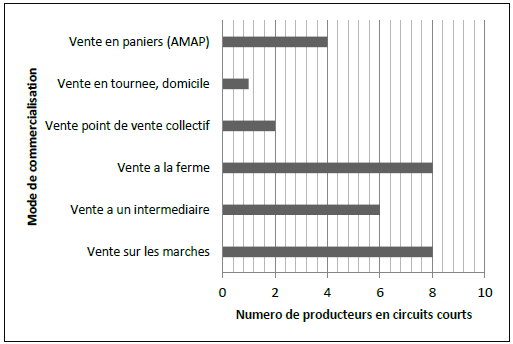 En vente directe, plusieurs modalités anciennes sont présentes sur le territoire, telle que la vente sur le marché, en tournée, ou la vente à la ferme, mais aussi des formes innovantes qui favorisent davantage l’installation de nouveaux producteurs, comme les AMAP, la vente par commande internet, ou les points de vente collectif. La commercialisation indirecte se caractérise par la vente à un intermédiaire comme par exemple, la restauration ou les magasins primeurs