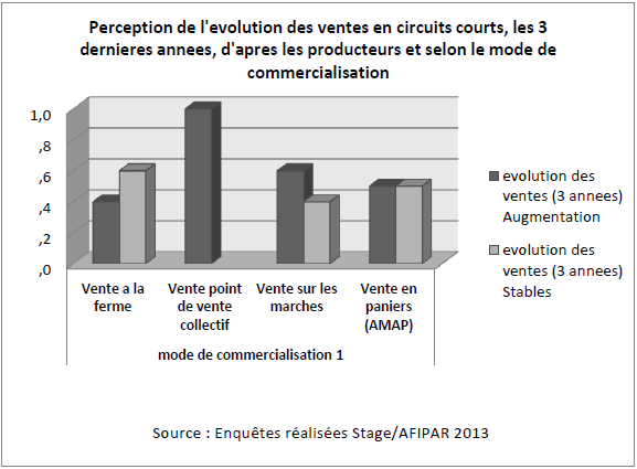 En suivant cette tendance, il est aussi intéressant d’observer les différences de perception sur les évolutions des ventes en circuits courts par rapport au mode de commercialisation. Les ventes à la ferme sont stables pour 3 producteurs sur 5 utilisant ce mode de commercialisation, en développement pour les autres. Les ventes sur les marchés sont plus importantes pour 3 producteurs sur 5 les pratiquant. Enfin, on peut voir que les producteurs qui pratiquent la vente en point de vente collectif, n’ont pas repéré des évolutions ni négatives ni stables au cours des trois dernières années, ce qui rassure la mise en marche de projets d’ouverture des magasins de producteurs. (Graphique No.4)