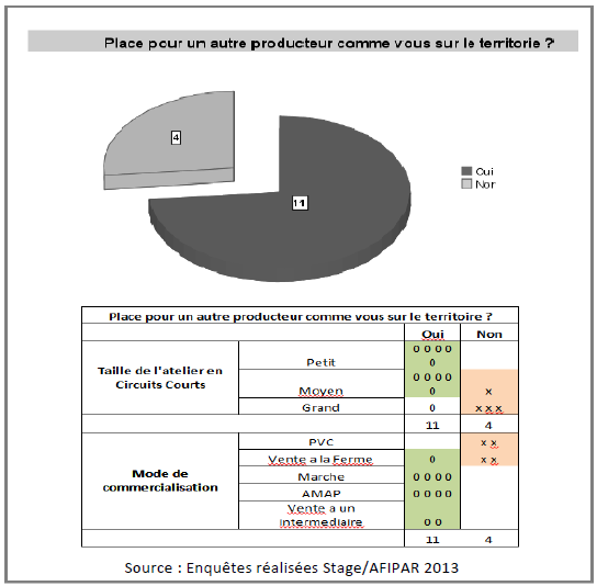 Ces évolutions plutôt positives ressenties chez les producteurs en circuits courts, font qu’ils sont plus ouverts aux possibilités d’installation d’autres producteurs en circuits courts. Sur le graphique No.5, notons que 11 producteurs sur 15 pensent qu’il y a une place disponible pour d’autres producteurs en circuits courts sur le territoire, contre 4 seulement qui pensent que leur production et commercialisation sont déjà saturées. Cette vision négative face à la concurrence provient surtout d’un type de producteur spécifique qu’on a pu bien identifier dans nos résultats(34).