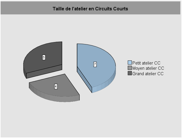Pour caractériser d’une façon générale les exploitations en circuits courts du haut val de Sèvre, on a évalué pour chaque type de production, la taille d’atelier en circuits courts. (Critères pris en compte : Taille de l’exploitation, volume de la production, équivalent temps plein consacré à l’atelier en circuits courts). D’après les résultats, on voit que les producteurs en circuits courts du Haut val de sèvre, possèdent différentes tailles d’atelier. On peut noter que ceux qualifiés de petite taille et taille moyenne sont majoritaires par rapports aux grands (graphique 1)