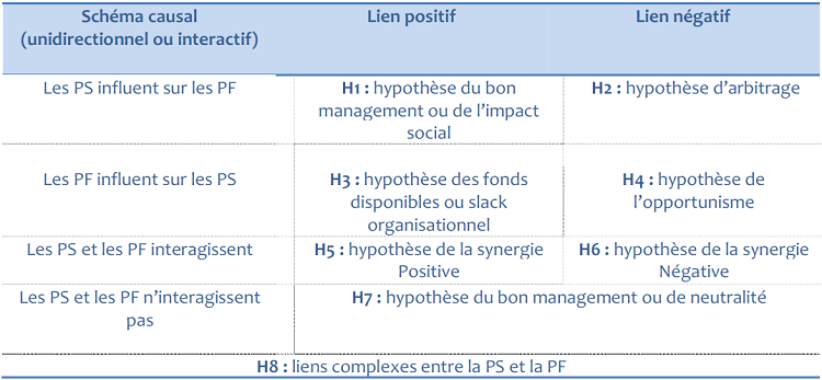 La relation existante entre la mission sociale et financière n’est pas toujours univoque. Pour une bonne analyse de cette dernière, deux dimensions sont prises en compte pour formuler les différentes hypothèses : le signe de la relation et la direction de la causalité (O’Bannon et al, 1993 cité par BERGUIGA op cit).