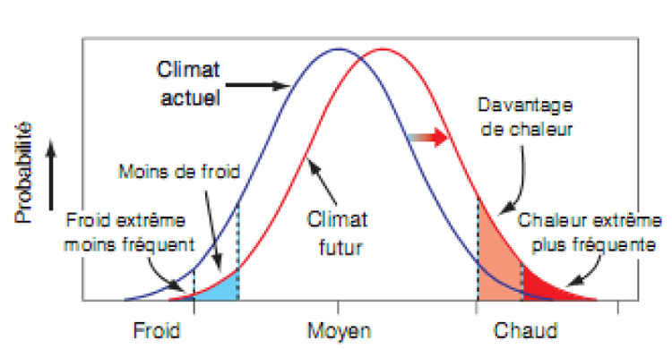 La courbe en bleue représente la distribution statistique des températures actuelles. Les températures sont souvent dans la moyenne, il fait rarement extrêmement froid (surface bleue sous la courbe) ou extrêmement chaud (surface rouge sous la courbe). Avec les changements climatiques, la distribution de la température pourrait se décaler vers les températures plus hautes (courbe rouge). Les effets de ce déplacement sur la fréquence des événements extrêmes sont particulièrement prononcés . il fait beaucoup plus souvent extrêmement chaud et beaucoup plus rarement extrêmement froid. Les changements relatifs sont peu perceptibles pour les températures se situant dans la moyenne.