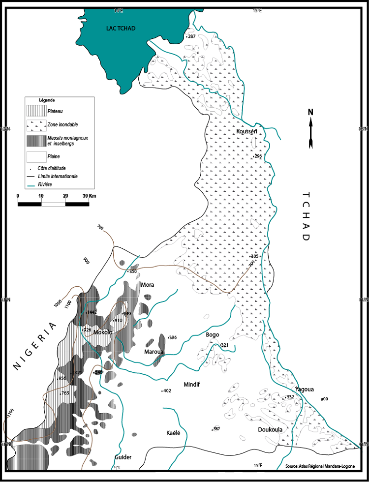 L’Extrême-Nord Cameroun forme un ensemble morphologique hétérogène qui s’échelonne d’ouest en est, de la chaîne montagneuse des Mandara à la plaine du Logone en passant par la plaine du Diamaré. Il s’incline du sud au nord en une pente douce. L’altitude varie entre 800 et 1000 m. Les plus hauts sommets sont les pointes de Kapsiki et Rumsiki culminant à 1.224 m. Une grande partie de la plaine camerounaise (8 000 km²), à l’est des inselbergs qui rompent ça et là cette monotonie, est périodiquement inondée par des eaux issues essentiellement des débordements du fleuve Logone. Elle reçoit également des eaux issues des cours d’eau torrentiels des Monts Mandara. Les eaux d’inondation sont conduites vers le Logone et le Chari.