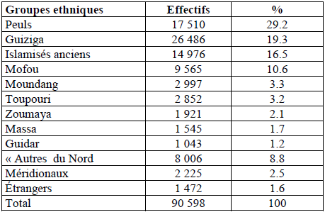 La population de l’Extrême-Nord est formée de plusieurs groupes ethniques dont les plus nombreux se retrouvent dans les Départements (Atlas de la Province Extrême-Nord Cameroun). Dans le département du Mayo Danay, on note la présence des Massa, les Mousgoum et des Toupouri; les Arabes Choa et Kotoko quant à eux se partagent les terres du Logone et Chari. Dans le Diamaré et le Mayo Kani, on a les Moundang et les Guiziga. Les Mafa et les Peulhs. Les Mandara, les Mada et les Kanouri se retrouvent dans le Mayo Sava et le Mayo Tsanaga. Maroua la capitale provinciale nous permet par exemple de mieux voir la configuration de la population globale comme le montre le tableau suivant :