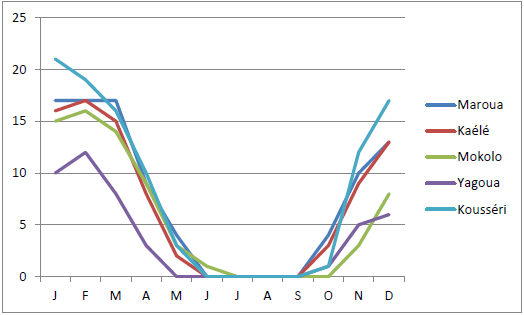 On constate (figure7) que le nombre de jours de brume sèche, dont l’intensité augmente avec la saison disparait totalement en saison des pluies. Le nombre de jour de brume sèche varie selon les stations, ce qui peut se traduire par une différenciation spatiale. En effet, l’une des caractéristiques de notre site d’étude est la présence de la brume sèche pendant la saison sèche. Ainsi, la station de Maroua totalise 91 jours de brume sèche, celle de Kaélé 83, celle de Mokolo 58, celle de Kousséri 99 et celle Yagoua 45.