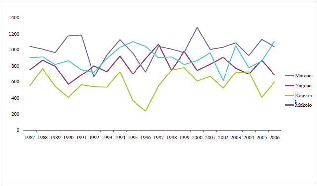 Figure 5 : Évolution interannuelle de la pluviométrie dans l’Extrême Nord: 1987-2006