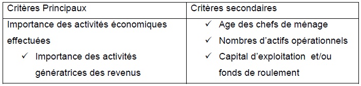 Les critères retenus pour caractériser les différents ménages suivis sont basés essentiellement sur l’importance des activités économiques et celle génératrices de revenus qui dépendent, étroitement du nombre d’actifs opérationnels, de l’âge des chefs de ménages ainsi du capital d’exploitation ou fonds du roulement de commerce pour chaque ménage suivi.