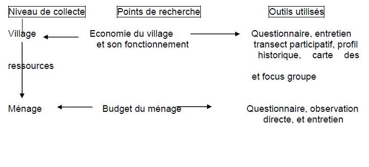 La collecte des informations aux différents niveaux mentionnés ci- dessous, a nécessité une panoplie d’outils de recherche participative qui a fait appel au principe de triangulation avec utilisation à la fois du questionnaire suivi ménage, de l’interview semi – structuré suivi du guide d’entretien, du focus groupe et de l’observation directe (annexes à partir de p…) à chaque niveau et point de recherche.