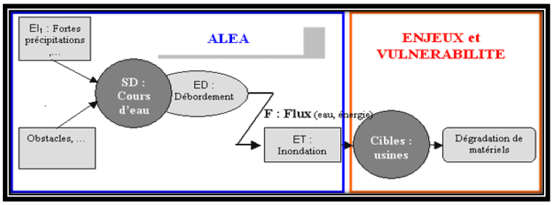 • Le modèle du processus de danger appliqué à un cours d’eau : Des scénarios couplant plusieurs processus peuvent être construits en utilisant ce modèle. Le couplage entre processus s‘effectue entre événements terminaux et événements initiateurs. La conséquence d‘un processus peut être la cause d‘un autre processus. Comme décrit sur le schéma précédent, les notions d‘aléas et de vulnérabilité peuvent être définies par rapport au modèle du processus de danger. L‘aléa est constitué d‘une chaîne causale qui va de l‘événement initiateur (fortes précipitations dans ce cas) à l‘événement terminal (inondation). Les enjeux et la vulnérabilité concernent les cibles exposées (usines dans ce cas). L‘événement déclencheur ou événement initial est dans ce cas le débordement du cours d‘eau.