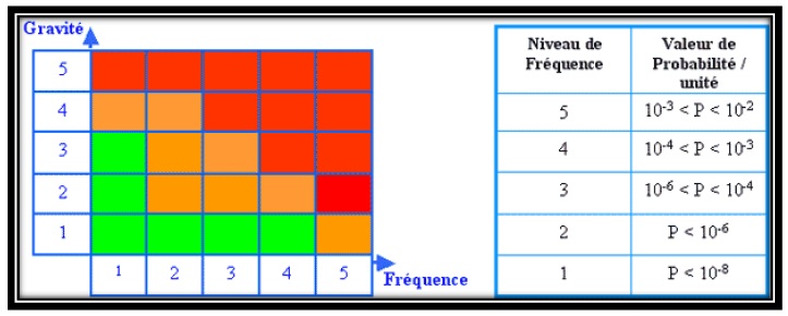 Exemple de grille de criticité (rouge=inacceptable, orange=tolérable, vert=acceptable) et niveaux de fréquence