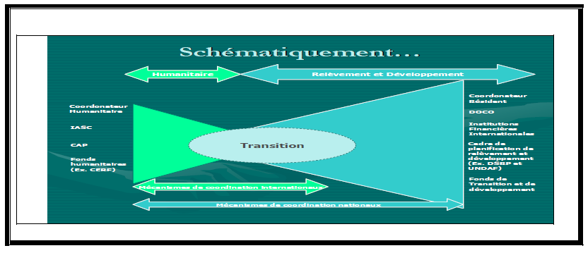 Selon le Secrétariat Générale des Nation Unies(56), la transition est :« La période entre les phases d‟urgence et de développement, en situation de post conflit, lorsque des besoins humanitaires doivent encore être adressés et que les bénéfices à long terme de la réhabilitation et de la reconstruction doivent être pleinement réalisés »