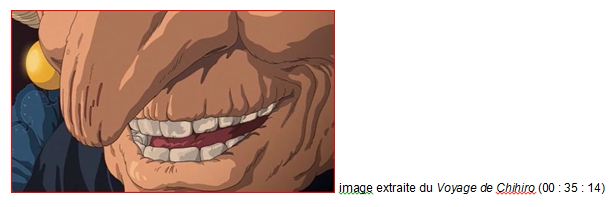 En effet, le premier plan montrant Yûbaba est un gros plan sur sa bouche, par laquelle elle ordonne d’une voix effrayante à Chihiro de rentrer dans l’immense hall au bout duquel son bureau est dissimulé. Sa bouche énorme montre des lèvres ridées, un nez immense et pointu plissé également. La voix est rauque, forte.