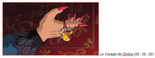 Le second gros plan montre la main de Yûbaba. Cette dernière nous informe bien sur le type de personnage qu’est cette sorcière. Les ongles vernis, les gros bijoux précieux et brillants, montrent une personne attachée aux apparences, mais qui souhaite surtout que sa puissance et sa richesse soient vues de tous. Il s’agit probablement d’une façon d’assurer que personne n’oublie qu’elle décide du sort de chacun, qu’elle a tous les droits.