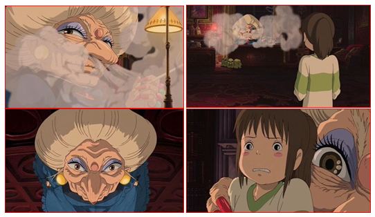 Les plans suivants de cette même scène, montrent que Yûbaba est un personnage laid, effrayant. Ses mains ressemblent à des pattes d’araignée, ses yeux et sa tête sont disproportionnés. L’effet voulu est de dégoûter le public, de la montrer sous un jour monstrueux, inhumain.