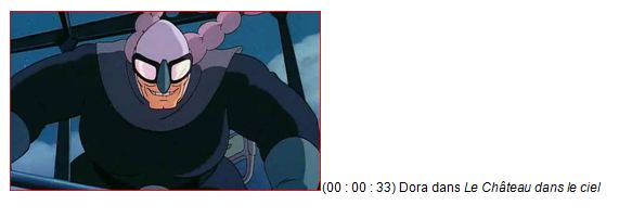 Par exemple, lorsqu’elle leur demande de jeter des wagons dans la vallée (scène de fuite de Sheeta et Pazu poursuivis par les pirates), elle donne le rythme, mais n’aide pas, les regardant travailler. Son personnage évolue : elle devient peu à peu attachante, une tante pour Sheeta et Pazu qui finiront par l’appeler « tantine ». Dora est une vraie féministe : lors de scènes d’action, où elle tire sur les agents du gouvernement, nous l’entendons dire : « vous allez voir ce que c’est qu’une femme ! », ou encore « C’est à pleurer ce qu’on est capable de faire pour sauver son homme », signifiant que les rôles de sauveur/sauvée sont ici inversés. Dora est loin du cliché de la ryosai kembo. Insoumise aux hommes, elle n’est pas l’esclave de ses fils, il s’agit plutôt du contraire. Mais en un sens, quand nous observons son comportement avec ses fils (dirigiste, autoritaire), Dora correspond à un certain aspect des mères japonaises, se mêlant des vies personnelles de leurs fils, étouffantes. Mais Dora en est une version beaucoup plus féministe, autoritaire, active, loin des sphères traditionnellement féminines.