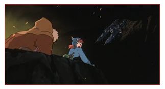 (01 : 41 : 01) Nausicaä menace deux ennemis ; sa position, en haut du cadre, montre sa position de supériorité et son pouvoir sur les deux hommes forcés de se rendre, dans Nausicaä de la vallée du vent