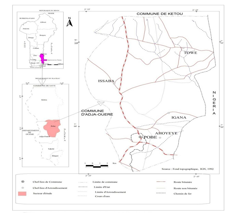 L’observation de la figure montre que la commune de Pobè est située au sud-est du Bénin et au centre est du département du Plateau à la limite frontalière avec le Nigeria, elle est limitée au nord par la Commune de Kétou, au sud et à l’ouest par la commune d’Adja-ouèrè et à l’est par le Nigeria.