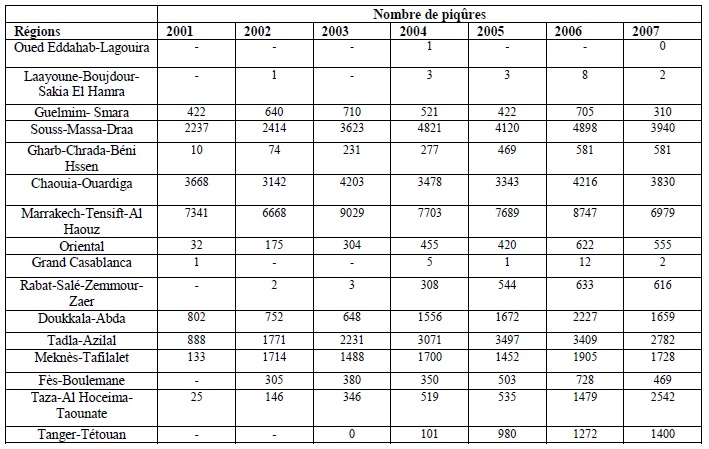 Le nombre de piqûres est important à Marrakech-Tensift-Al Haouz, Chaouia-Ouardiga, Tadla-Azilal, Souss-Massa-Draa et Guelmim- Smara par ordre décroissant. Par contre, l’incidence la plus faible à nulle est notée dans les régions du Grand Casablanca, Oued Eddahab-Lagouira, et Laayoune-Boujdour-Sakia El Hamra.