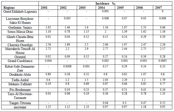 Les résultats de la répartition du nombre de piqûres scorpioniques et de l’incidence selon les régions et l’année sont représentés respectivement dans les tableaux XXIII et XXIV.