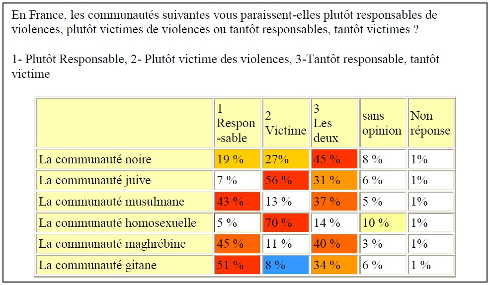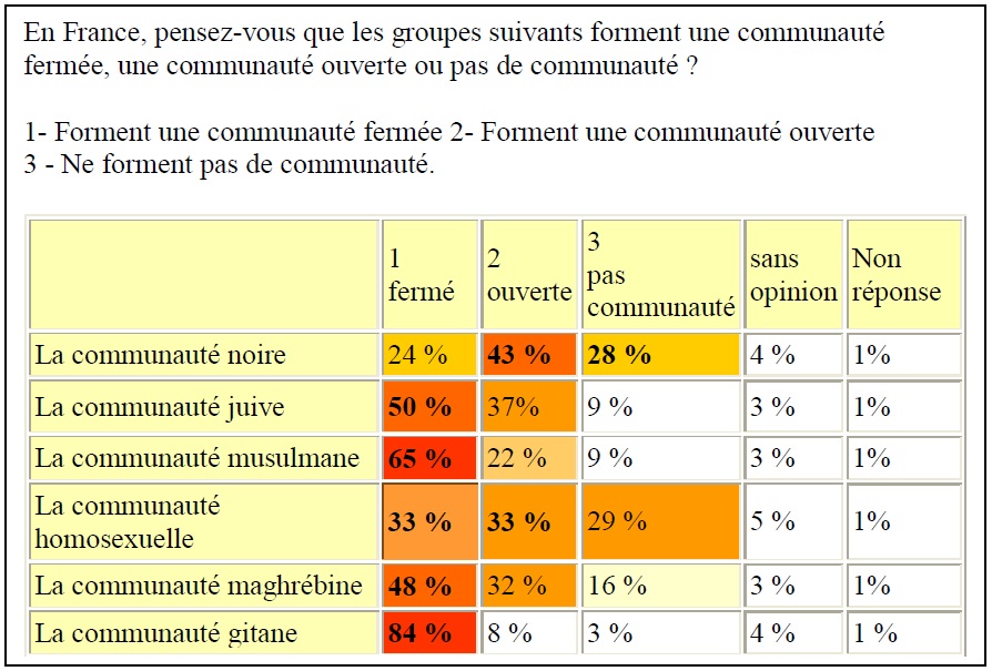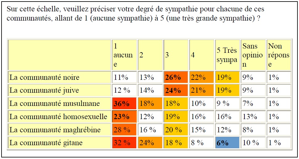 A ce propos, un sondage réalisé par le site Internet ExpressionPublique.com (NDA : site créé par Jérôme Jaffré, directeur du Centre d’études et de connaissance sur l’opinion publique et Philippe Chriqui ancien directeur des études d’opinion publique de l’IFOP) est édifiant. Réalisé en 2005, ce dernier révèle en effet que la « communauté musulmane » est celle qui dispose en France du « capital sympathie » le plus bas (cf. tableau récapitulatif ci-dessous).