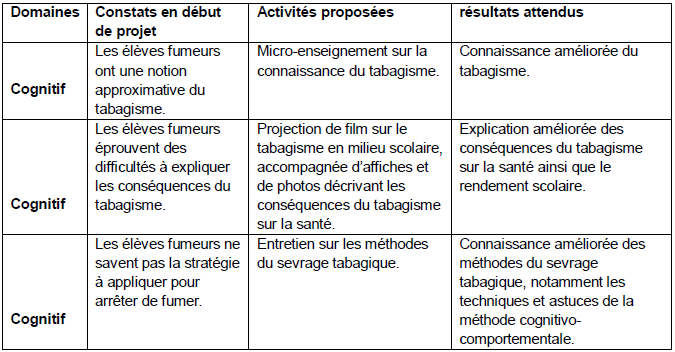 En début de projet, les élèves fumeurs ont peu de connaissances du tabagisme : sa définition, ses causes et conséquences, les éléments toxiques du tabac. Aussi ne savent t-ils pas comment procéder pour arrêter de fumer. Fort de ce constat, des activités mettant l’accent sur les lacunes des élèves en la matière, sont à mener à l’effet de leur permettre une prise de conscience susceptible d’aboutir à un sevrage tabagique définitif. Outre ces acquis, il semble intéressant d’évaluer le niveau de dépendance à la cigarette de chacun des élèves pour mieux exercer l’action éducative (voir annexe 2).
