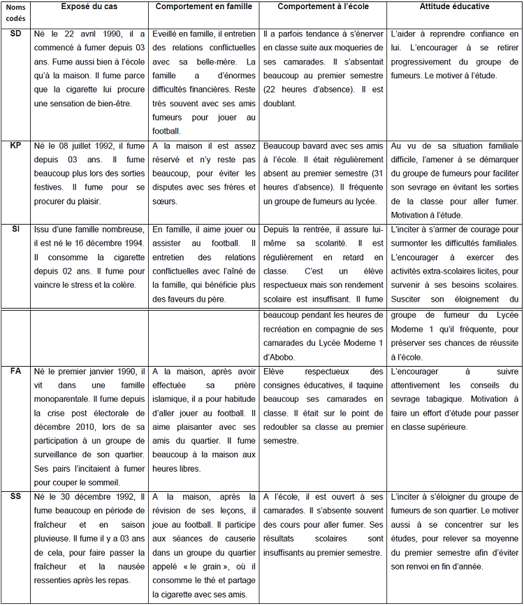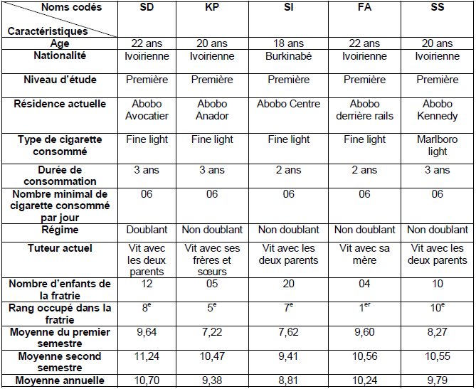Il ressort de ce tableau que les bénéficiaires sont tous des élèves de première. Ils sont de nationalité ivoirienne, à l’exception de SI qui est burkinabé. Leur âge est compris entre 18 et 22 ans. Ils résident tous à Abobo et fument la cigarette light. Trois d’entre eux, les plus anciens consommateurs fument depuis 3 ans (SD, KP et SS). Quant à SI et FA, ils fument depuis deux ans. Ils consomment tous en moyenne 06 cigarettes par jour. Parmi eux, seul SD reprend sa classe. En outre, SI, SD et SS vivent chacun avec ses géniteurs, au contraire de KP qui vit avec ses frères et soeurs. FA vit avec sa mère. Aussi faut-il noter que les résultats scolaires de ces élèves sont dans l’ensemble insuffisants au premier semestre. Mais au second semestre, chacun d’eux a connu une progression. Ainsi, SD et FA sont passés en classe supérieure. KP et SI menacés de renvoi au premier semestre, ont pu avoir les moyennes de redoublement. Egalement SS qui redouble sa classe, a progressé tout de même au second semestre.