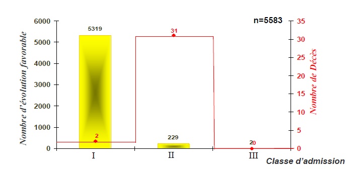 Ce résultat est à prendre avec beaucoup de précaution, en effet si le taux de létalité spécifique de la classe 2 paraît logique, le taux observé au niveau de la classe 3 (0.05%) serait du uniquement au faible effectif des patients qui se sont présentés au niveau de cette classe (n=2). Dans la littérature, la létalité spécifique au niveau de cette classe est plus importante que celle de la classe 2. Nous reviendrons sur ce point dans la partie consacrée à la discussion.